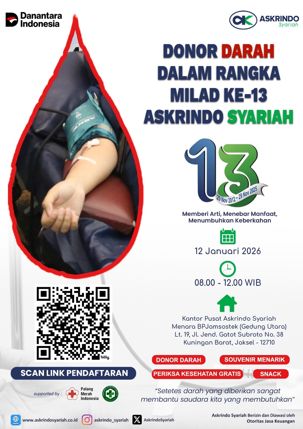 Askrindo Syariah dalam rangka milad ke-13 melaksanakan kegiatan Donor Darah yang akan dilangsukan pada tanggal 12 Januari 2026 mulai pukul 08.00 - 12.00 WIB berlokasi Kantor Pusat Askrindo Syariah Menara Bpjamsostek (gedung utara) lantai 19.